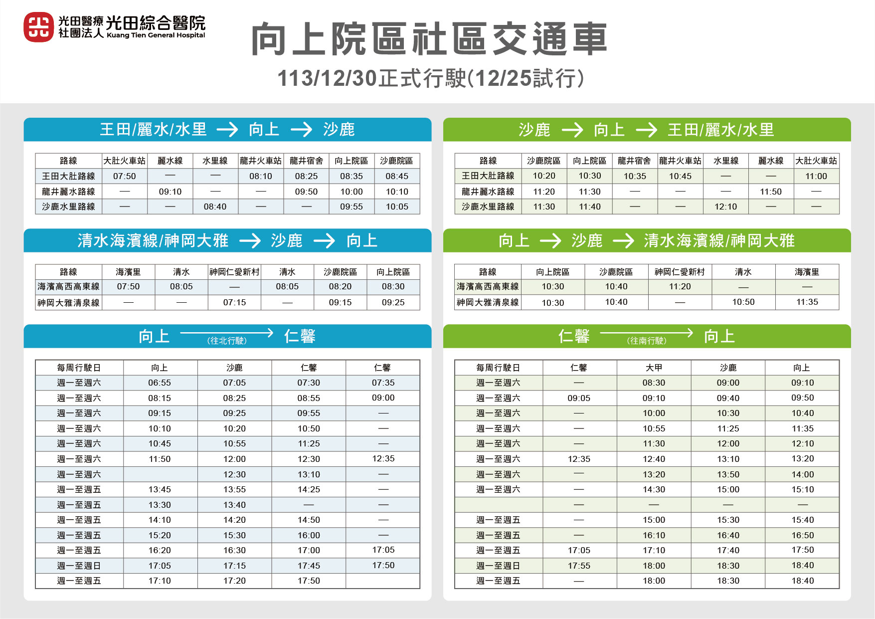 沙鹿院區至向上院區接駁車(週一至週五7:00~22:00;週六7:00~13:00;13:00~22:00,若要搭乘者知會保全,由保全協助叫接駁車)